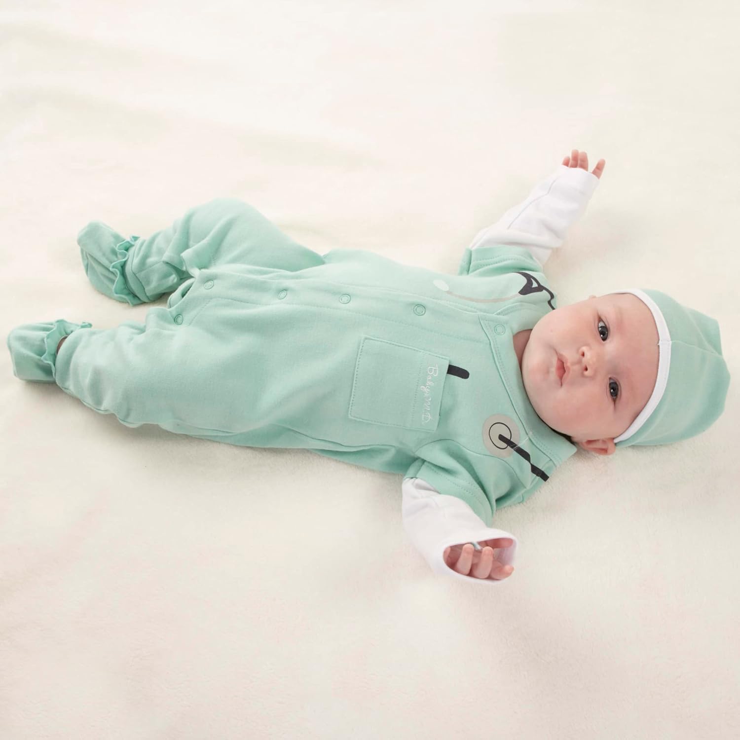Confeccionado en 100% algodón suave y delicado, este mameluco garantiza comodidad y seguridad para la piel sensible de tu recién nacido. Incluye una gorrita quirúrgica a juego y prácticos cierres de presión para facilitar cada cambio.