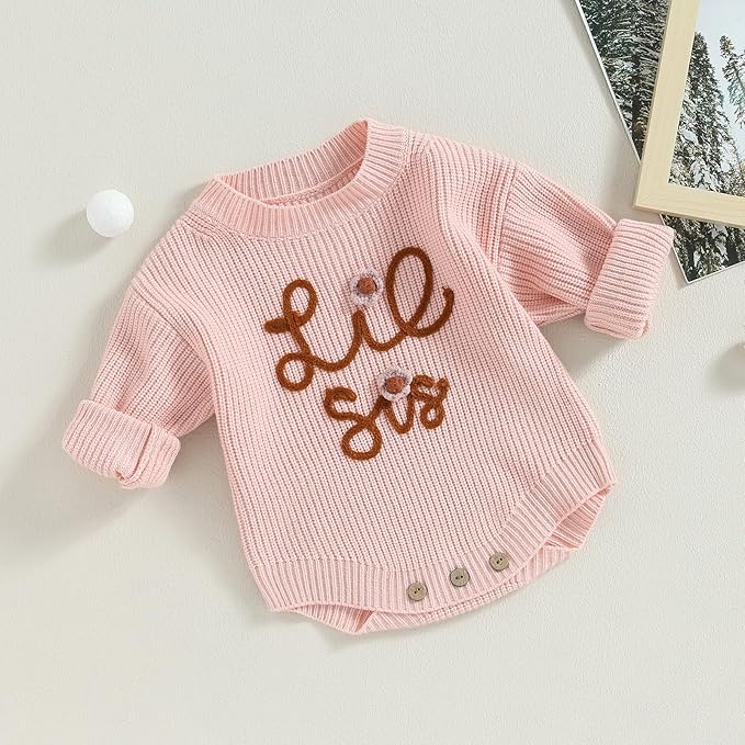 Este bonito suéter cuenta con manga larga y un diseño de cuello redondo. Está decorado con encantadores detalles florales y un patrón de bordado que dice "Lil Sis", agregando un toque de dulzura y moda. El ajuste holgado garantiza comodidad y libertad de movimiento para tu pequeña.