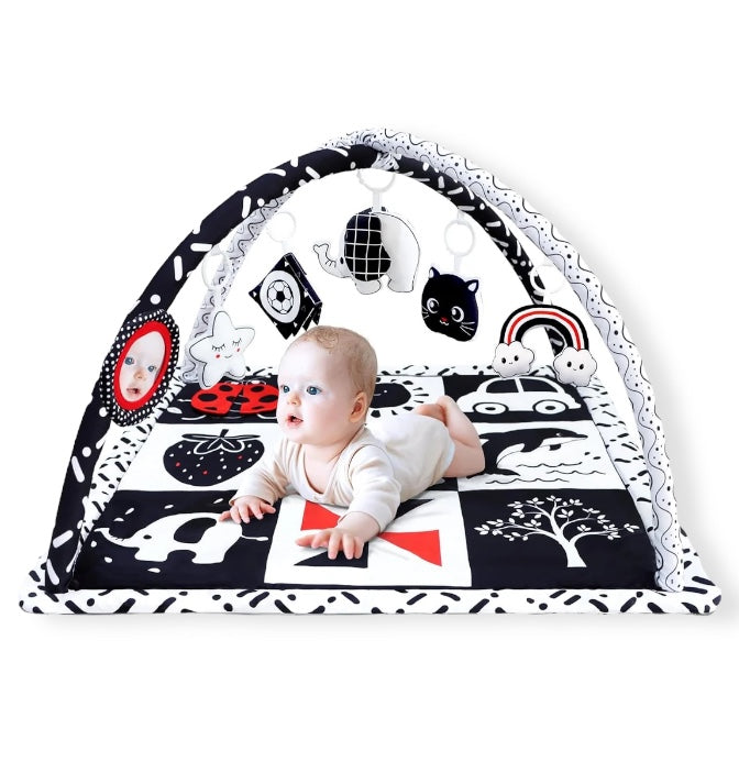 👶 Estimulación visual optimizada: El gimnasio de juego para bebés está diseñado especialmente para los recién nacidos, cuyas habilidades visuales aún están en desarrollo. Con colores de alto contraste (rojo, blanco y negro), es más fácil para el bebé enfocarse y mejorar su visión, ayudando a acelerar el proceso de desarrollo visual en sus primeros meses.