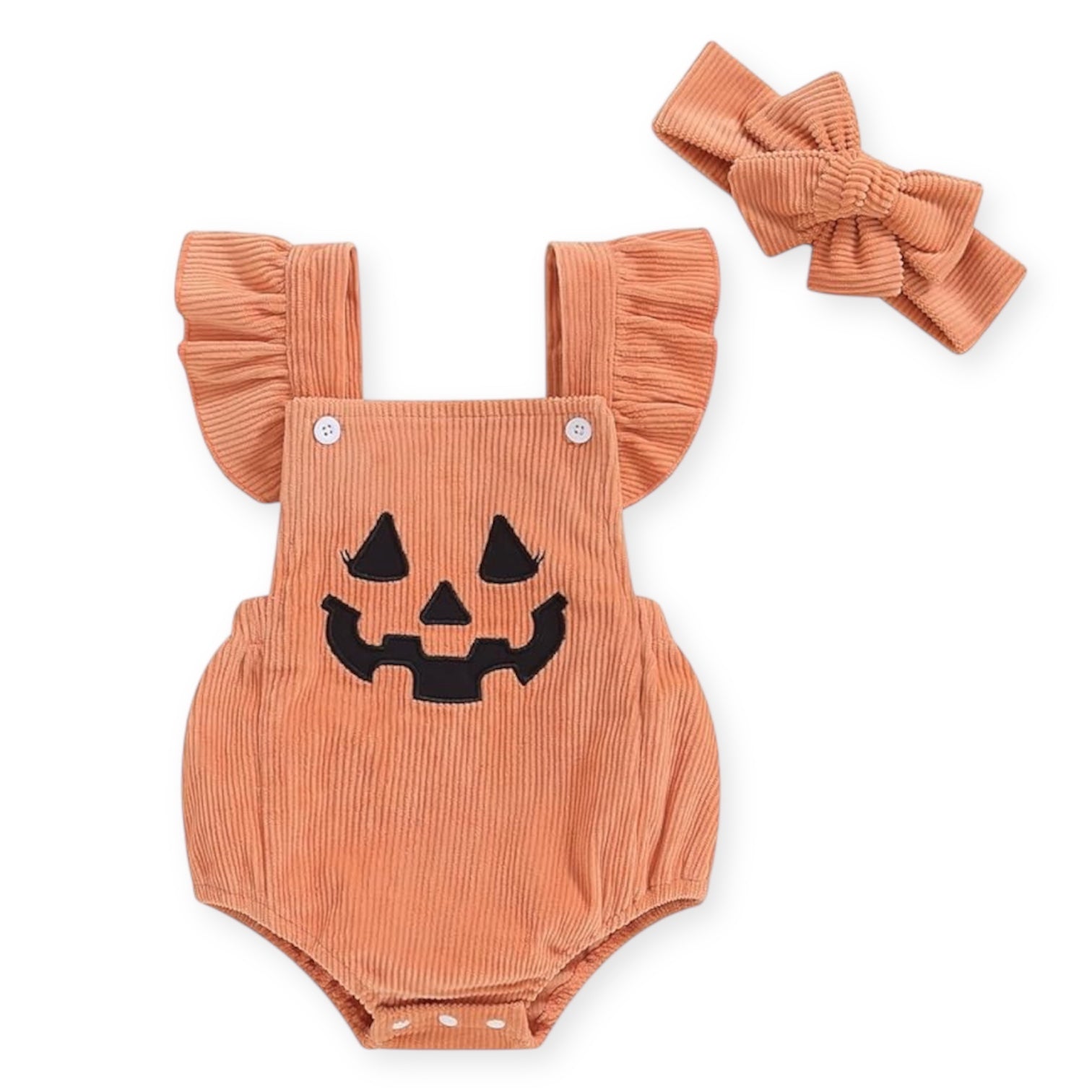 Haz que tu pequeña luzca irresistible en su primer Halloween con este adorable mameluco de calabaza acompañado de una diadema con lazo a juego. Un conjunto suave, cómodo y lleno de encanto para guardar recuerdos inolvidables.