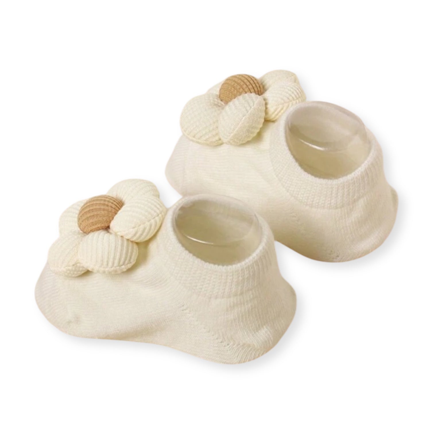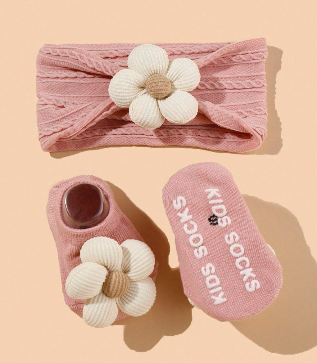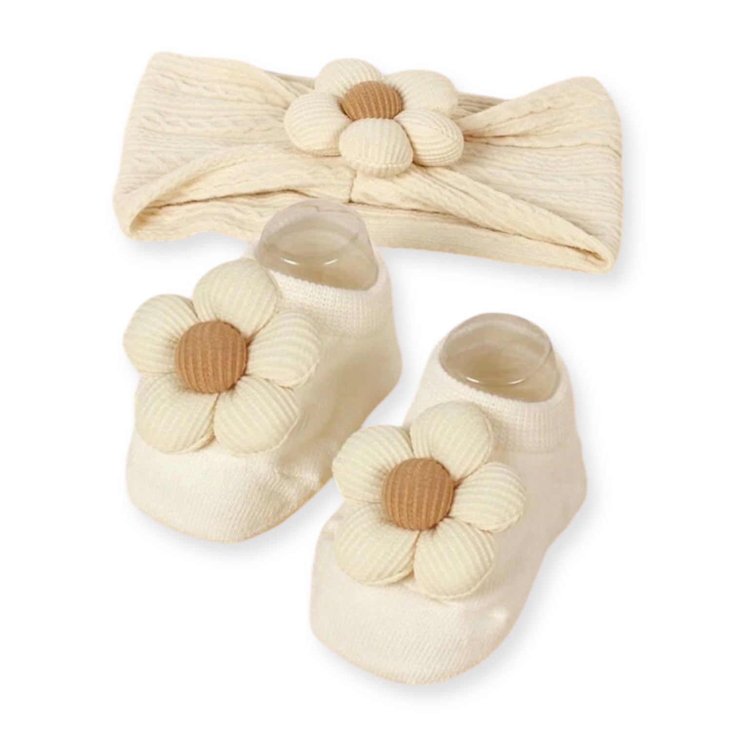 El Set Dahlia es la combinación perfecta de dulzura y funcionalidad. Incluye una diadema elástica decorada con flor delicada, hecha con materiales suaves y transpirables que cuidan la piel sensible del bebé, y unas medias antideslizantes que brindan seguridad en cada pasito. 💕