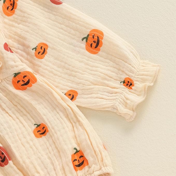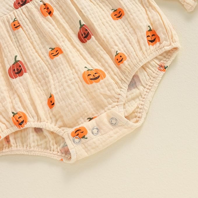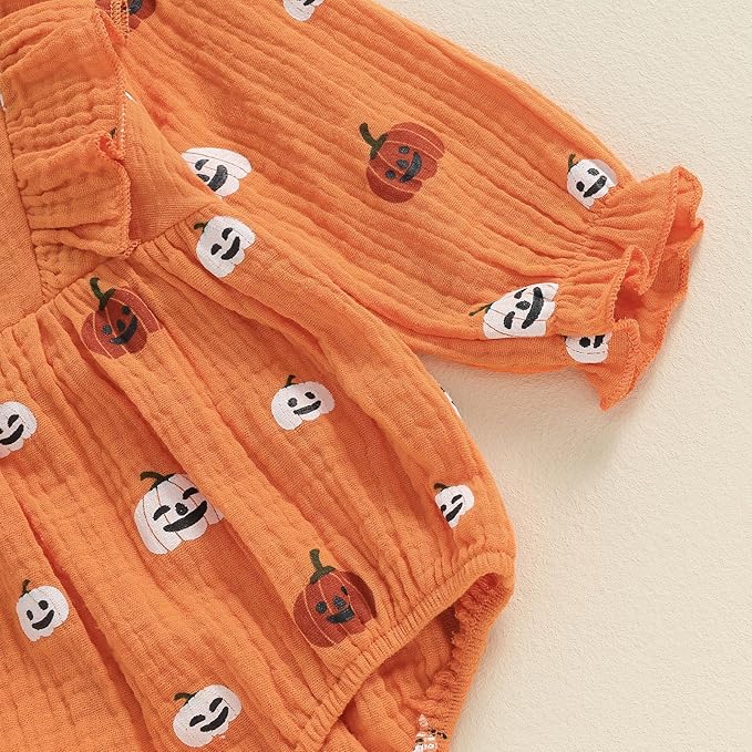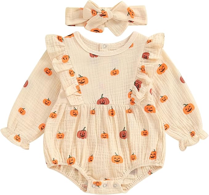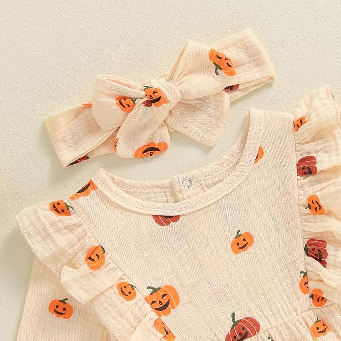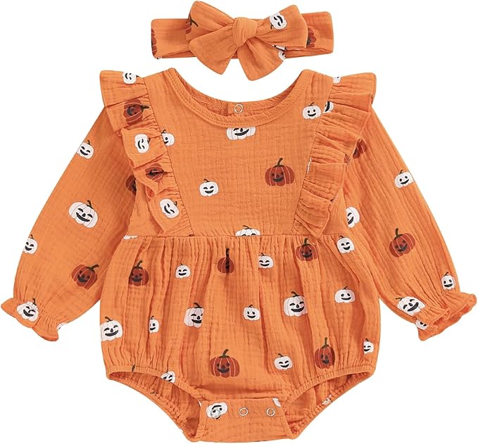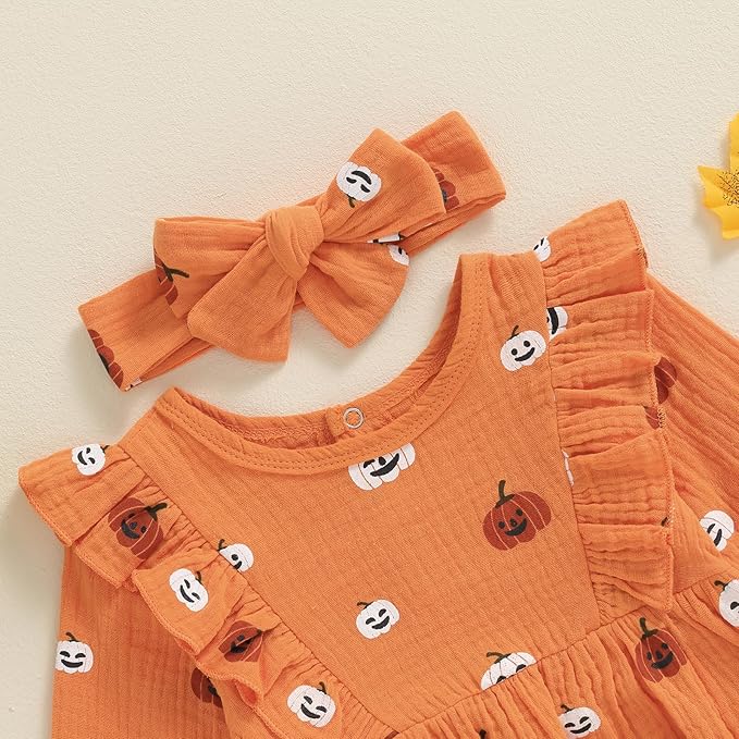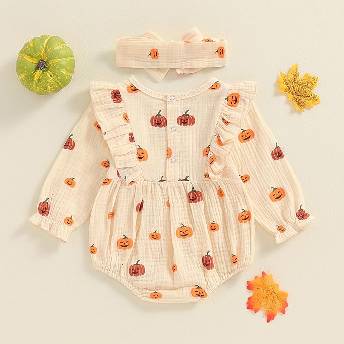 🧡 Diseño adorable: mameluco de manga larga con volantes y estampado de calabaza, acompañado de una tierna diadema a juego para completar el look otoñal.