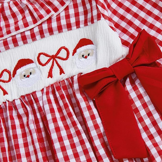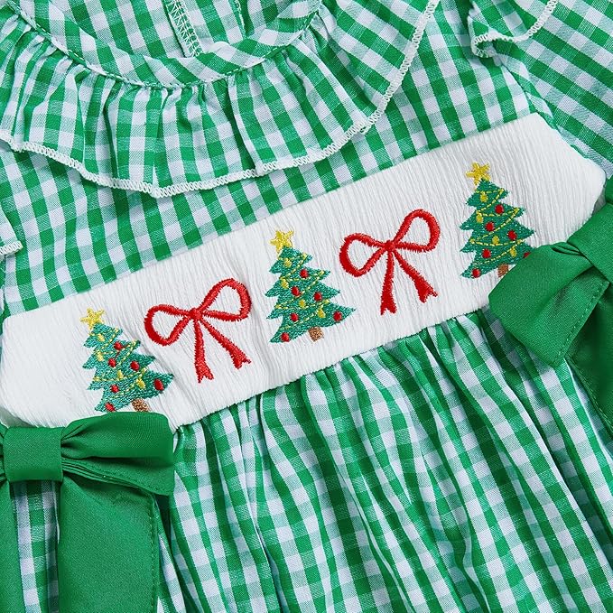 Diseño fruncido de manga larga con bordados navideños que capturan el espíritu de la temporada.