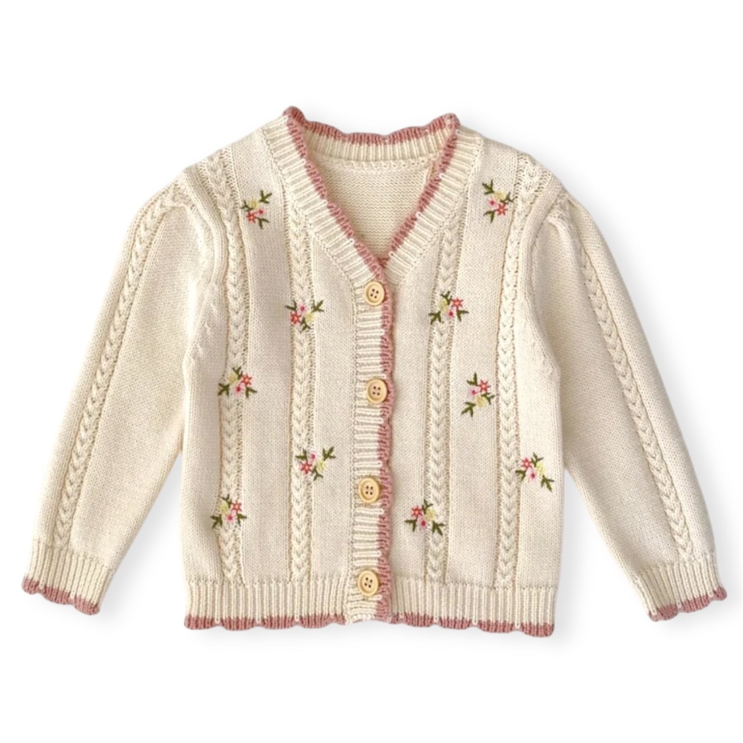 Descripción: Nuestro Suéter Daphne tejido de punto para bebés, tiene adorables mangas largas florales bordadas y un estampado floral en tonos albaricoque, este cárdigan de moda combina suavidad y estilo. Su diseño con botones delanteros y escote en pico añade un toque encantador, mientras que su tejido de 100% algodón garantiza comodidad. ¡Ideal para mantener a tu bebé abrigado y a la moda en cualquier salida!