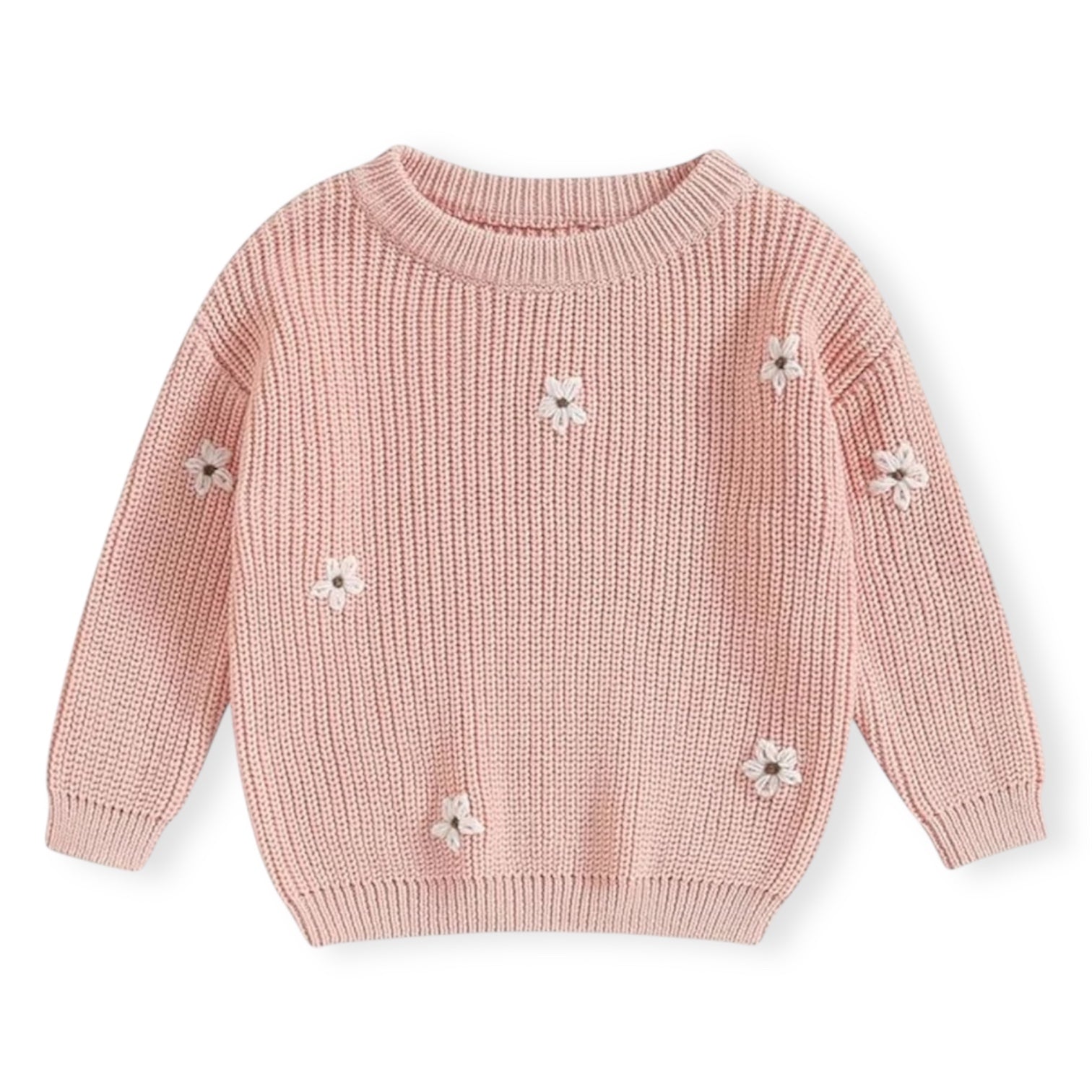 Este encantador suéter para bebé niña presenta manga larga, cuello redondo y un patrón de flores que añade un toque moderno y encantador a su estilo.