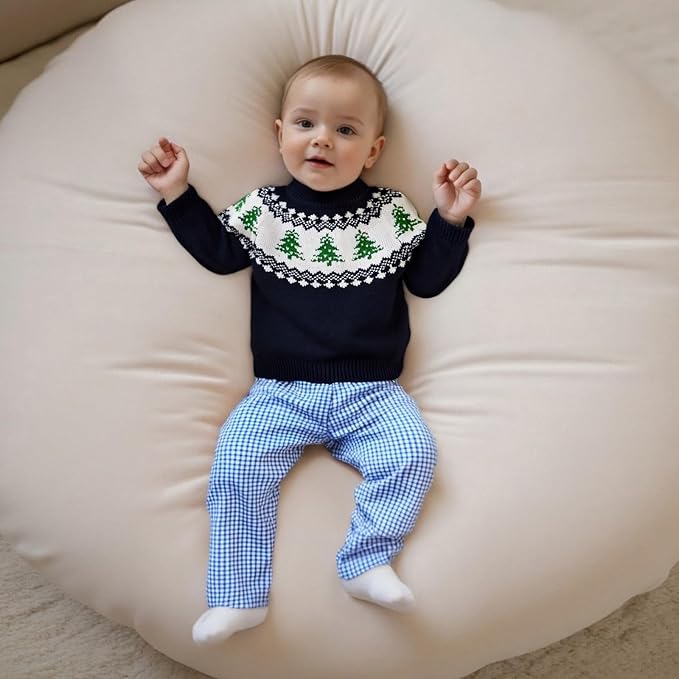 Confeccionado en una mezcla suave de 95% algodón y 5% poliéster, ofrece una textura cómoda, cálida y delicada con la piel del bebé, ideal para disfrutar desde los primeros días de diciembre hasta las fotos junto al árbol. Su diseño de cuello alto, manga larga y estampado de árbol de Navidad crea un look navideño encantador que nunca pasa de moda.