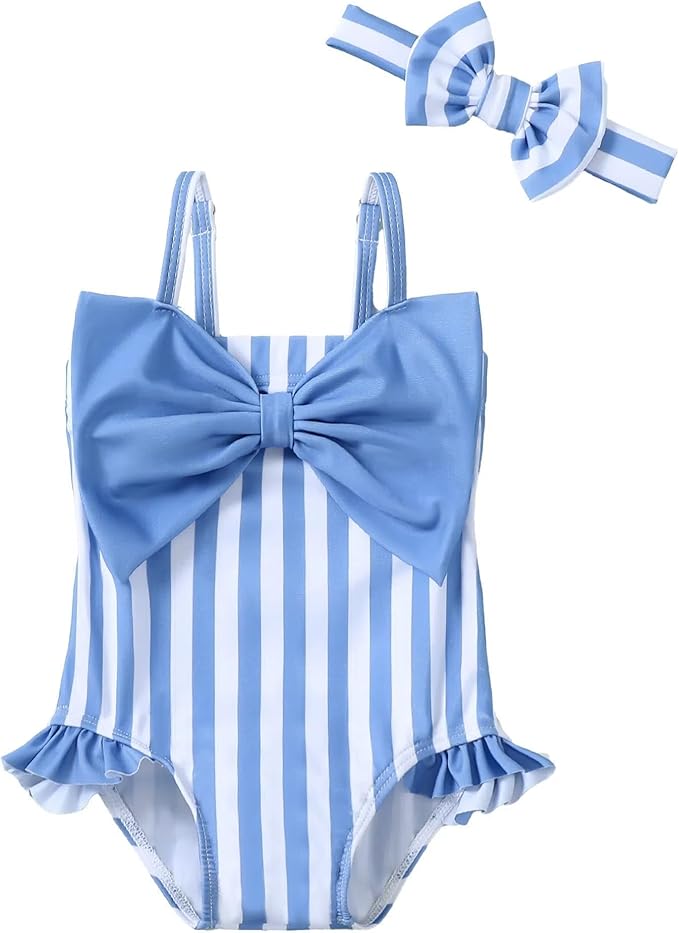 Diseño Adorable: Incluye un traje de baño de una sola pieza con correas ajustables, volantes y una encantadora decoración de lazo, acompañado de una diadema a juego. Disponible en hermosos patrones como mariposas, margaritas, rayas, leopardo, corazones, sirenas y más.