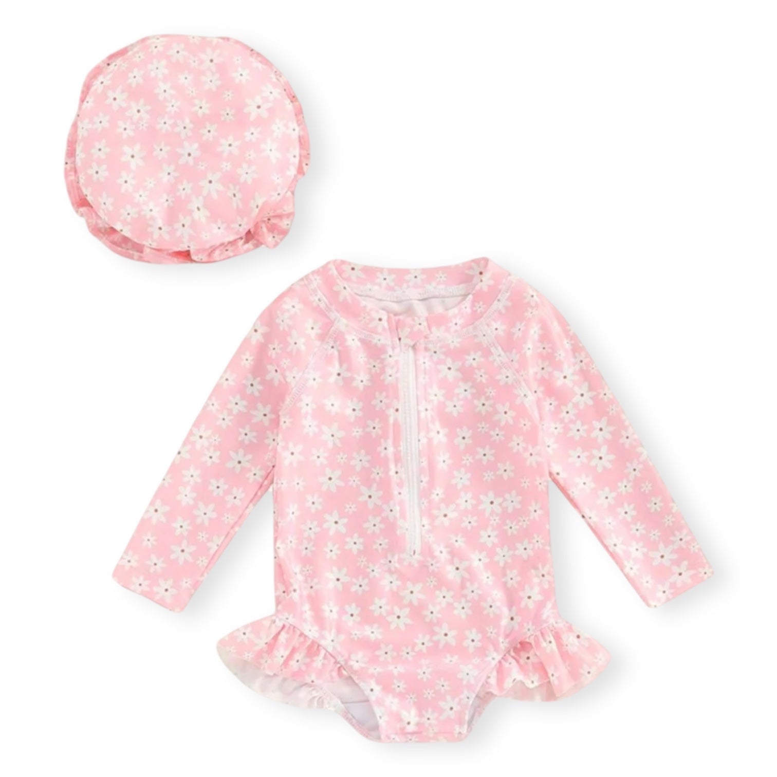 Descripción: ¡Listo para divertirse bajo el sol! Este adorable traje de baño de dos piezas para bebé niña incluye un bañador con mangas largas y un gorro a juego.